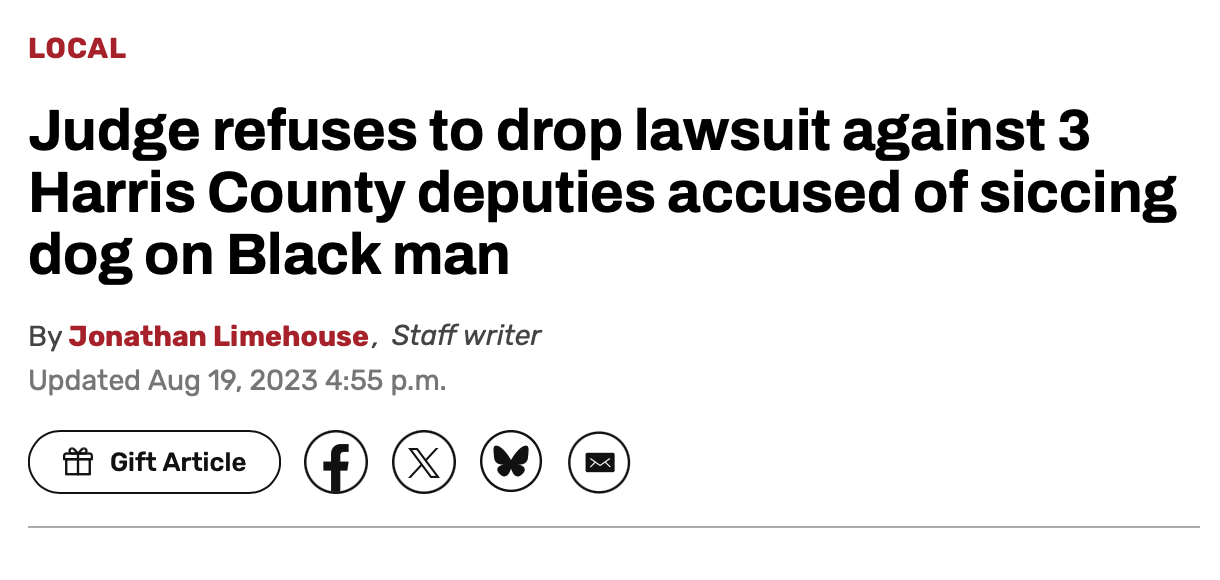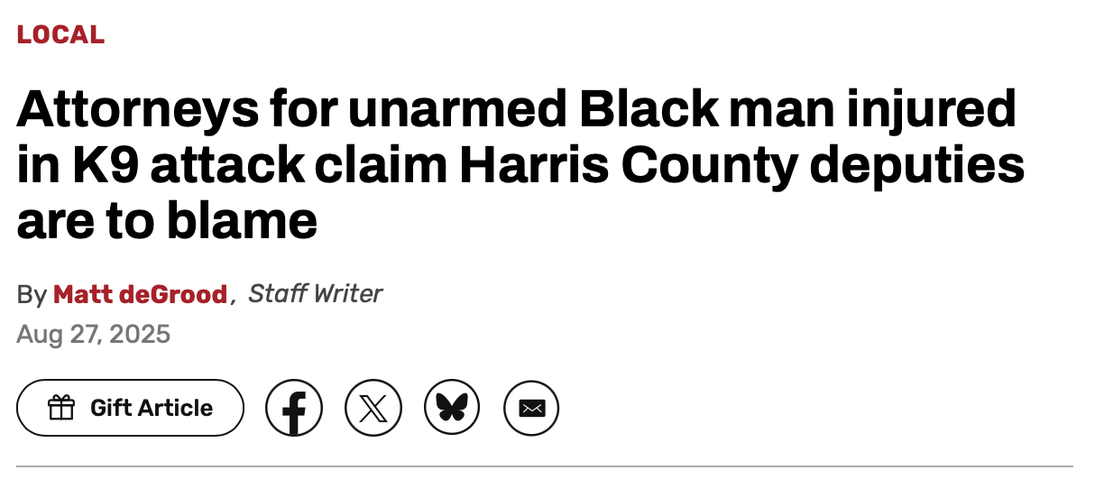 “On February 22, 2021, Sergeant Robert Johnson of the Harris County Constable’s Office (Precinct 1) ordered his police dog to attack Mr. Thomas while he lay prone on the ground with his hands outstretched and clearly visible. Mr. Thomas made no attempt whatsoever to flee, fight back, or resist. He was unarmed.